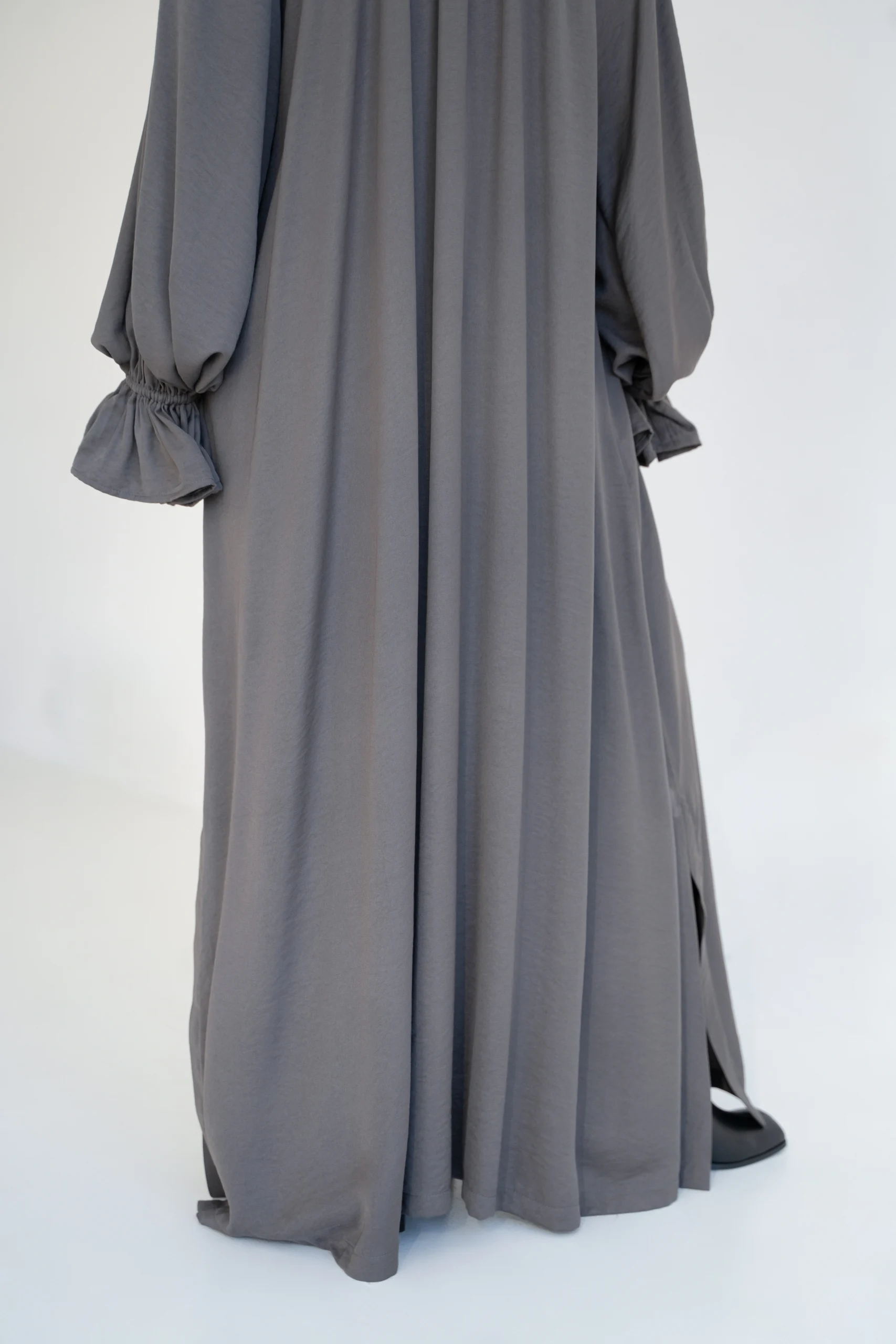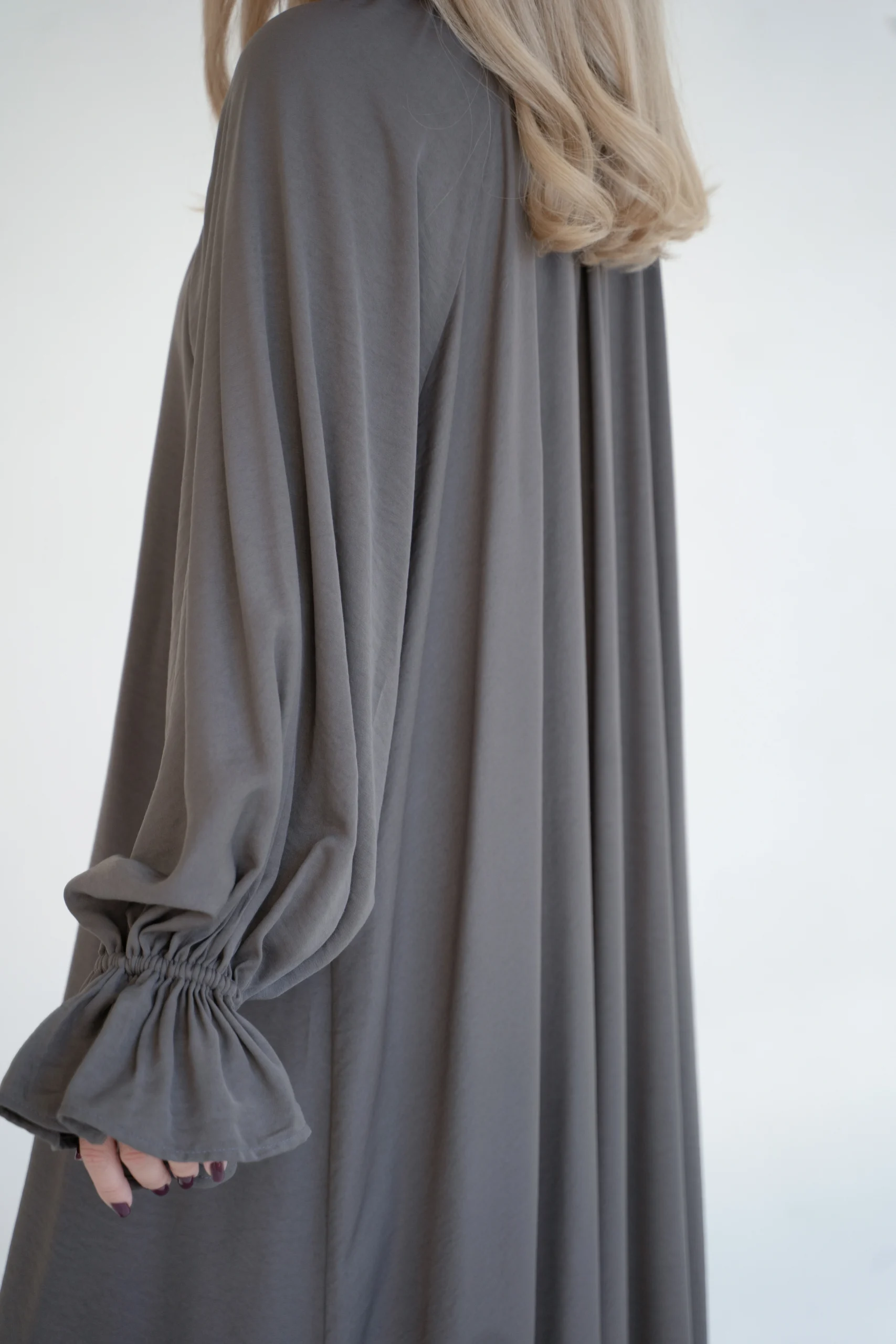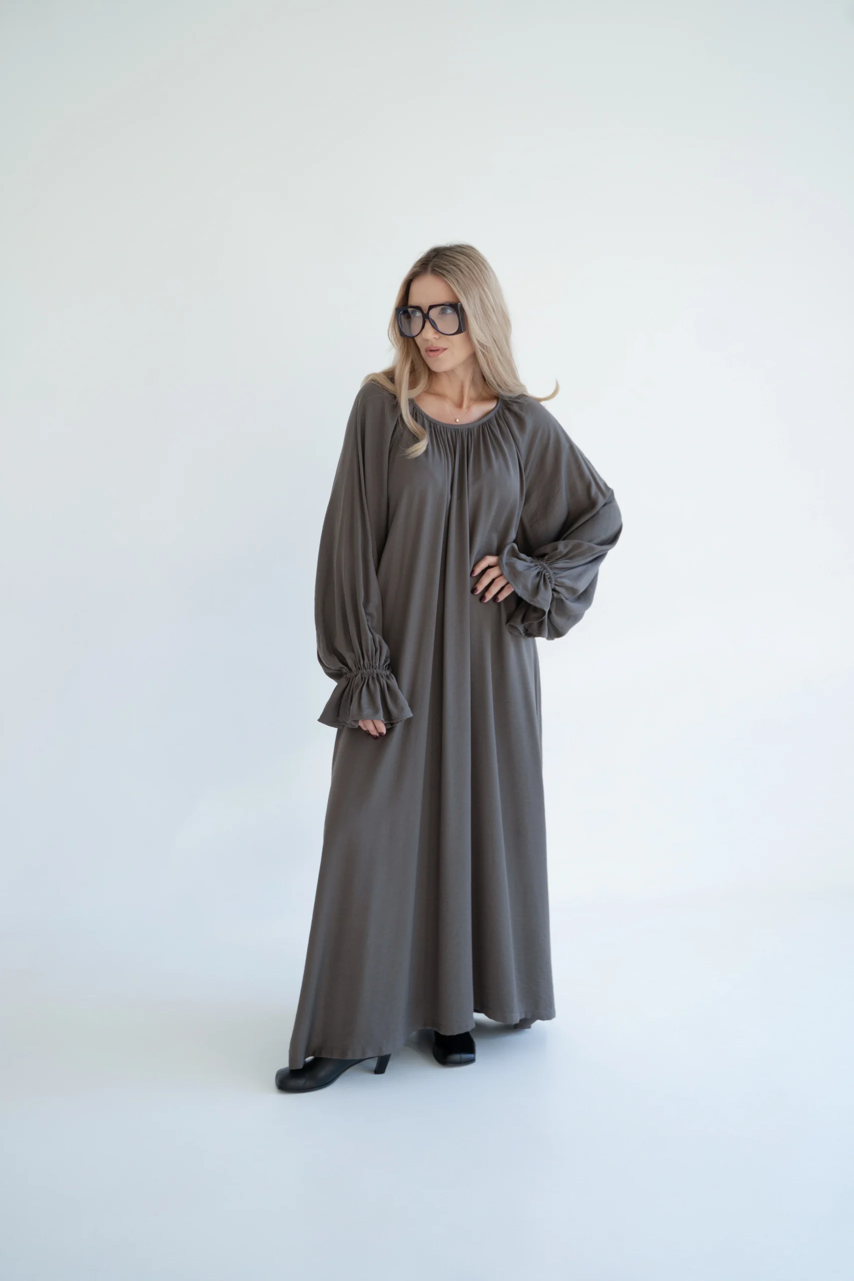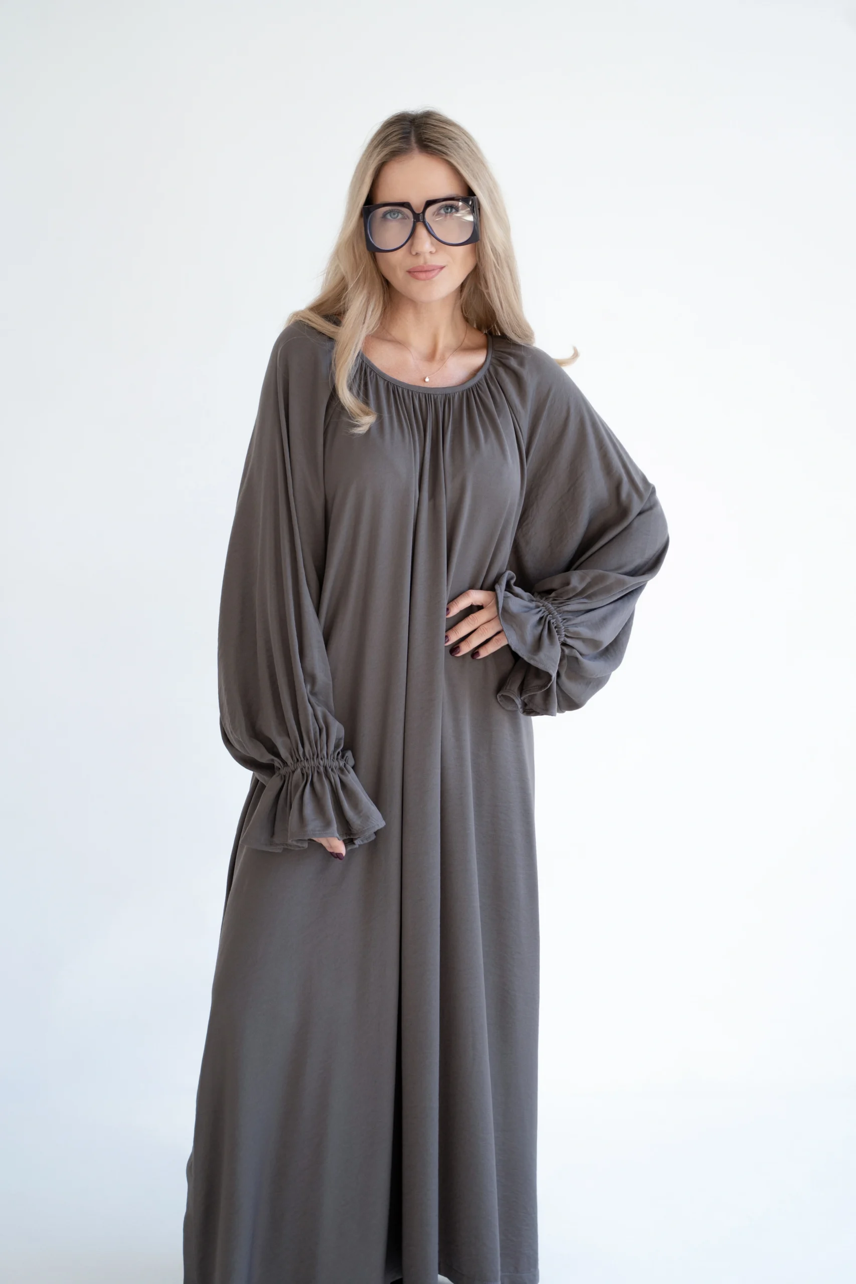 – Suknelės išskirtinumas itin plačios rankovės su gražiais rankogaliais