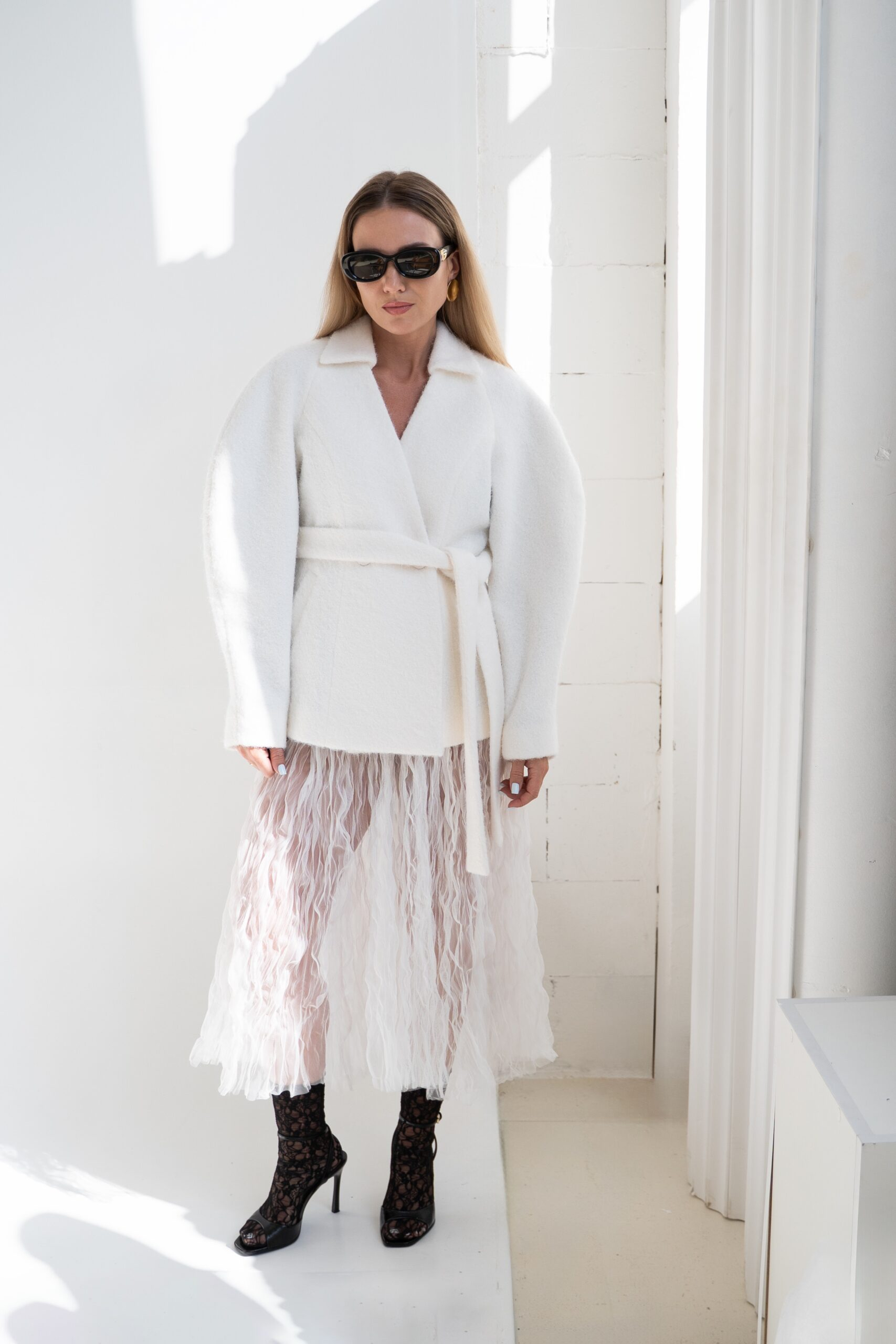 – Švarkas turi diržą, kuris dar labiau įlemenuoja